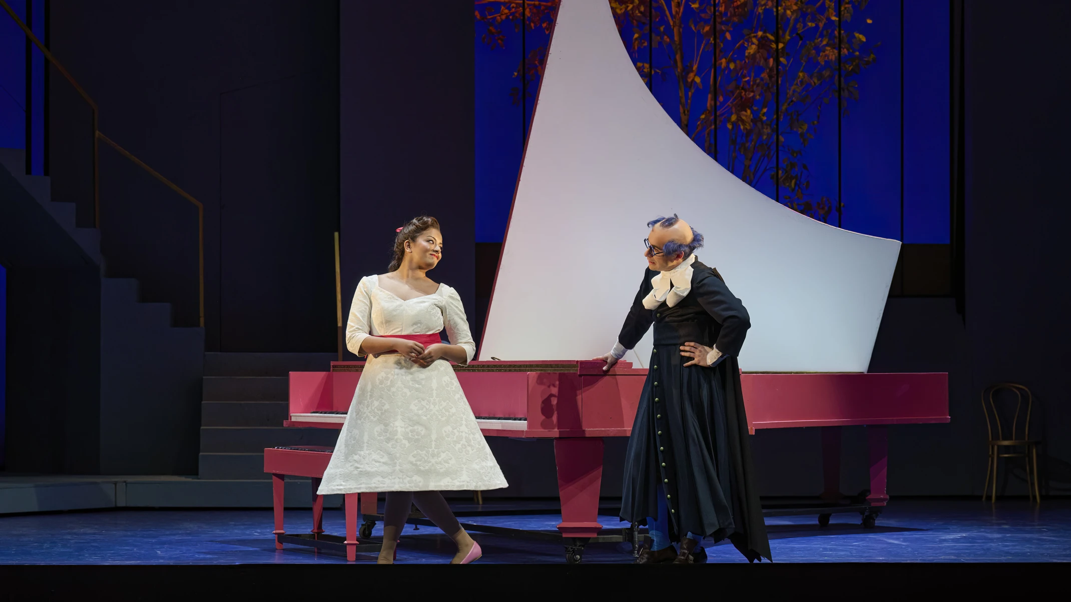 Rosina’s showpiece “Una voce poco fa” suffers likewise, with a cascade of simultaneous actions—two stocking-headed painters tackling a tree and other characters bopping through background gags. Audience laughter at these visual sideshows jars against Deepa Johnny’s acrobatic vocal pirouettes.